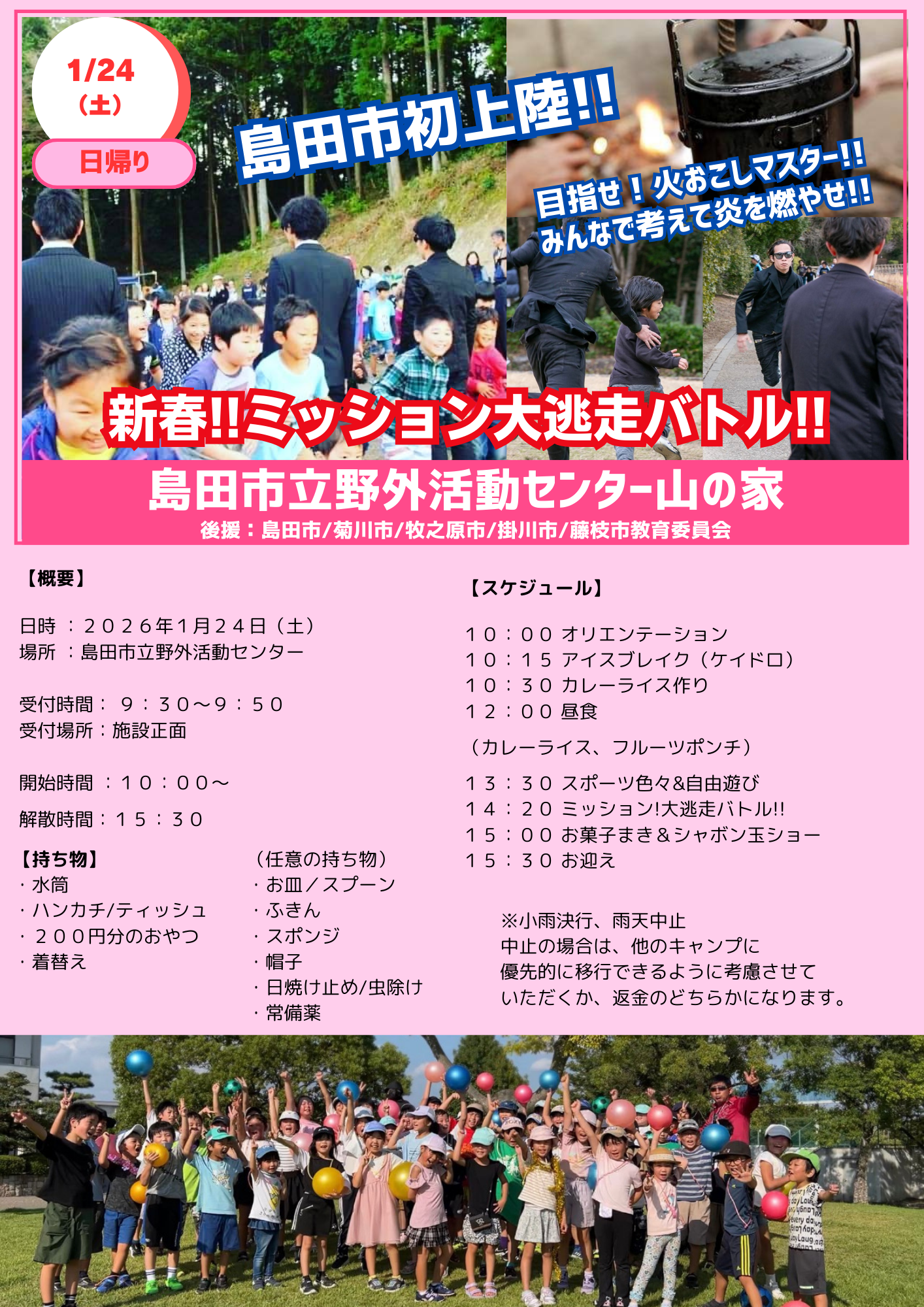 島田市立野外センター山の家は、豊かな山と川に囲まれた自然体験施設です。すぐそばには伊久美川が流れ、四季折々の木々や澄んだ空気に包まれながら、思いきり体を動かして遊ぶことができます。